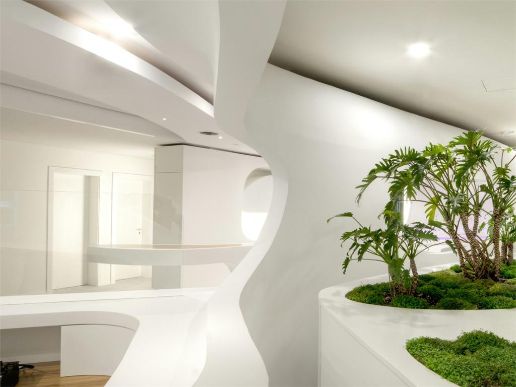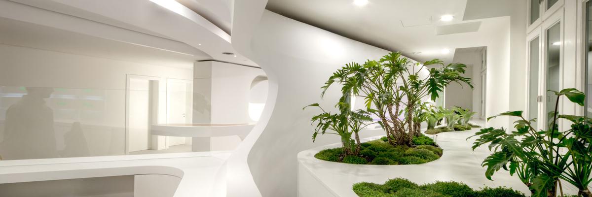 در طراحی دکوراسیون اداری مدرن این دفتر فضایی اختصاصی برای گل ها و گیاهان در نظر گرفته شده است .