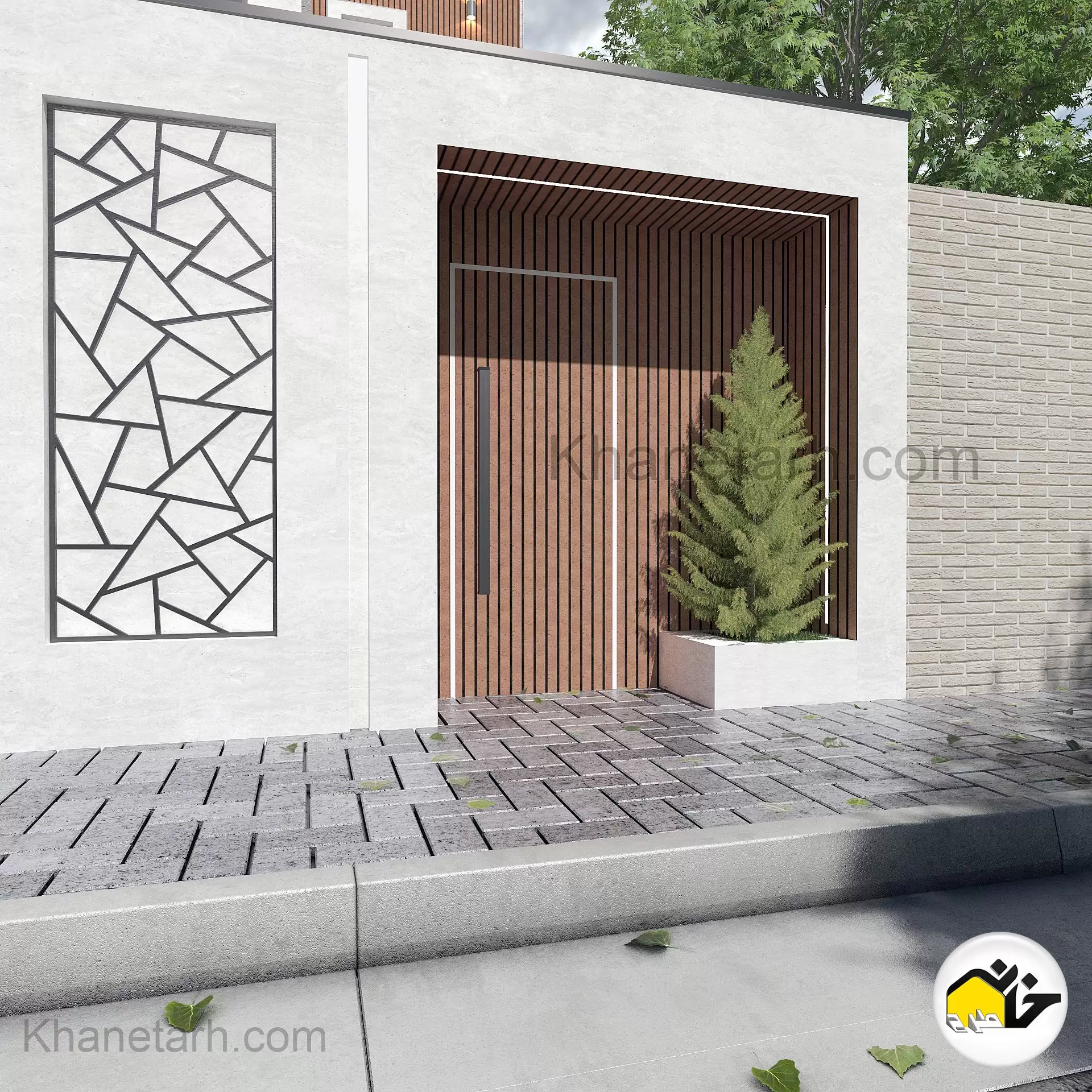 این نمای مدرن ساده با دو متریال سنگ و آجر نسوز ، طراحی شد که البته دست کارفرما برای تغییر متریال آجر نسوز و جایگزینی آن با پنل pvc یا چوب ترموود باز بود و بسته به شرایط اقتصادی میشد یکی از این دو متریال را جایگزین آجر نسوز کرد.