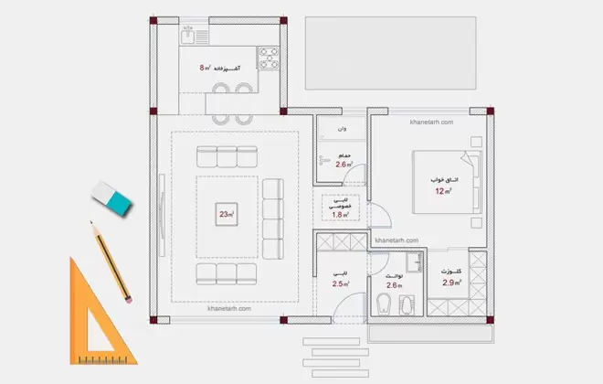 نقشه ویلا کوچک مدرن | نقشه خانه روستایی ۶۵ متری